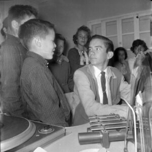 Photo: Presidio grade school students touring radio station XEOG, Ojinaga, Mexico, with broadcaster Sócrates Bustamente Vela, circa 1959. Photo courtesy of the Elton Miles Collection 1922-1984, Archives of the Big Bend, Sul Ross State University.